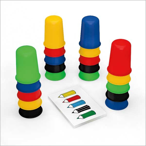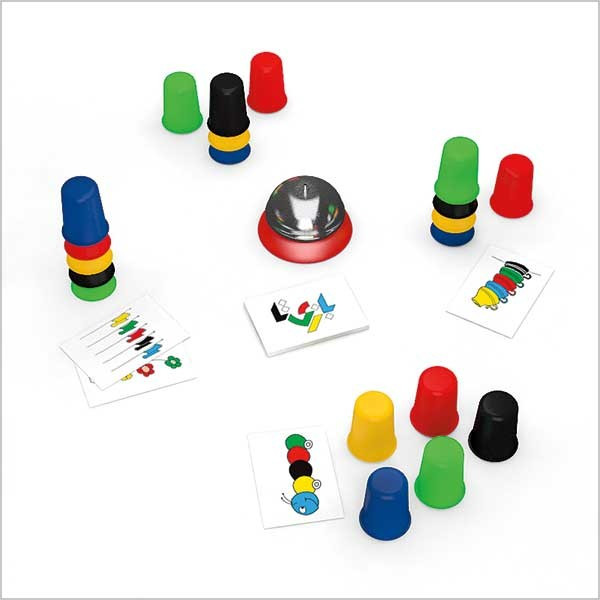 زنگ هم جایی قرار میگیرد که در دسترس همه باشد هر بار یک کارت رو میشود و بازیکنان باید به سرعت لیوانها را بر اساس الگوی نشان داده شده در کارت بچینند در واقع فرد با نگاه کردن به تصویر می بایستی به صورت سمبلیک، 5 لیوان خود را دقیقا در همان وضعیتی که در کارت آمده است بچیند. و این نیاز به قدرت تشخیص قوی و دریافت اطلاعات دیداری سریع دارد هرچه سرعت عمل شما دراین کار بیشتر باشد موفق تر خواهید بود هر بازیکنی که بتواند زودتر لیوانهای خود را به طور صحیح بچیند زنگ را به صدا در می آورد. در پایان برنده بازی کسی است که کارتهای بیشتر را از آن خود کرده باشد کودکان با انجام این بازی سرعت واکنش دیداری خود را افزایش داده و همچنین چون علاوه بر دیدن می بایستی که لیوانها را بچینند می بایستی دست ورزی قوی هم داشته باشند بازیکن در لحظاتی که این بازی را انجام میدهد باید کاملا متمرکز باشد و به همین دلیل این بازی به تمرکز بالایی نیاز دارد.
